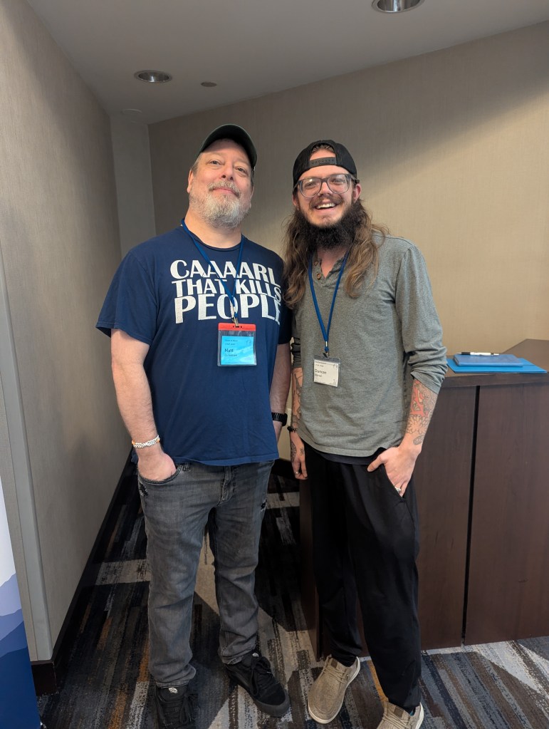 At the conference, I had the great pleasure of meeting Matt Dinniman, the Author of many books, but most recognizably, Dungeon Crawler Carl. This series is also on the required reading list. Matt was excellent to talk to, and listening to him speak was a chaotic whirlwind of humor mixed with genuine gems of literary knowledge. It was a unique experience that I don’t think a lot of people get, and I feel extraordinarily lucky to have experienced it for myself. Even if he never gets to see this, I want to thank Matt one more time for an unforgettable weekend.